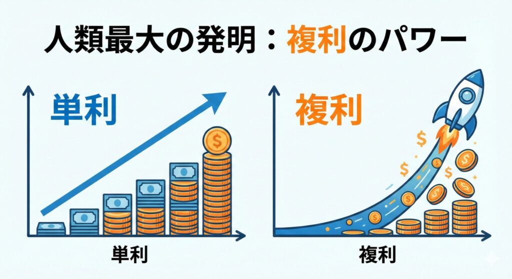 ここからが本題です。投資の世界にはアインシュタインが「人類最大の発明」と呼んだ力があります。 それが**「複利(ふくり)」**です。